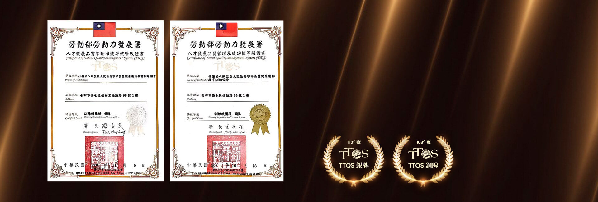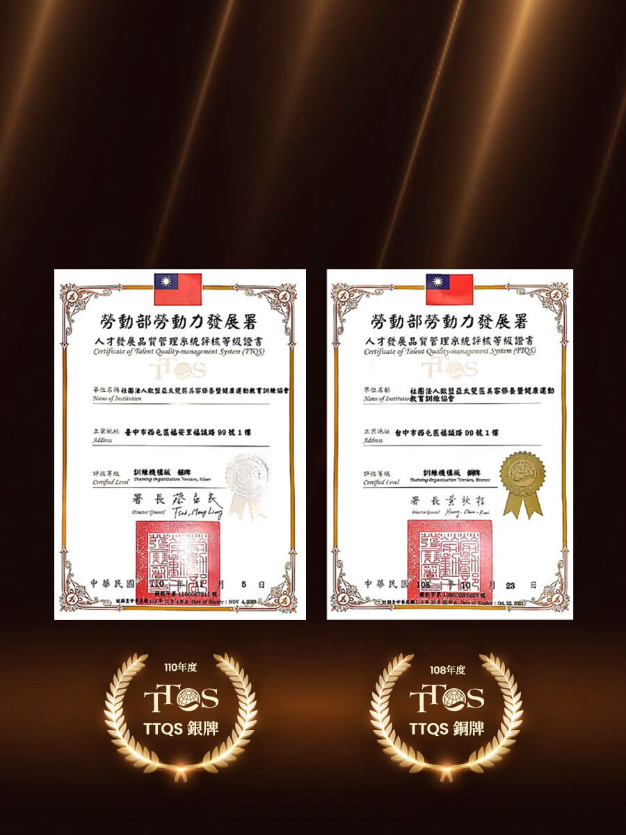佳儷曲線運動會館的卓越表現贏得了多項殊榮,包括TTQS人才發展認證、國家品牌玉山獎以及運動企業認證。這些榮譽代表著不斷追求卓越、和推動健康的堅定承諾肯定。