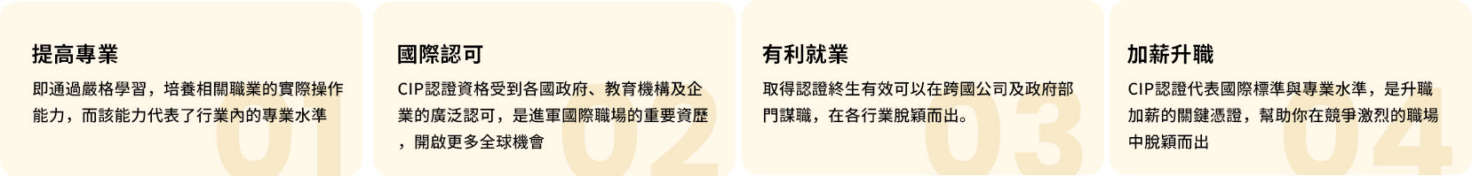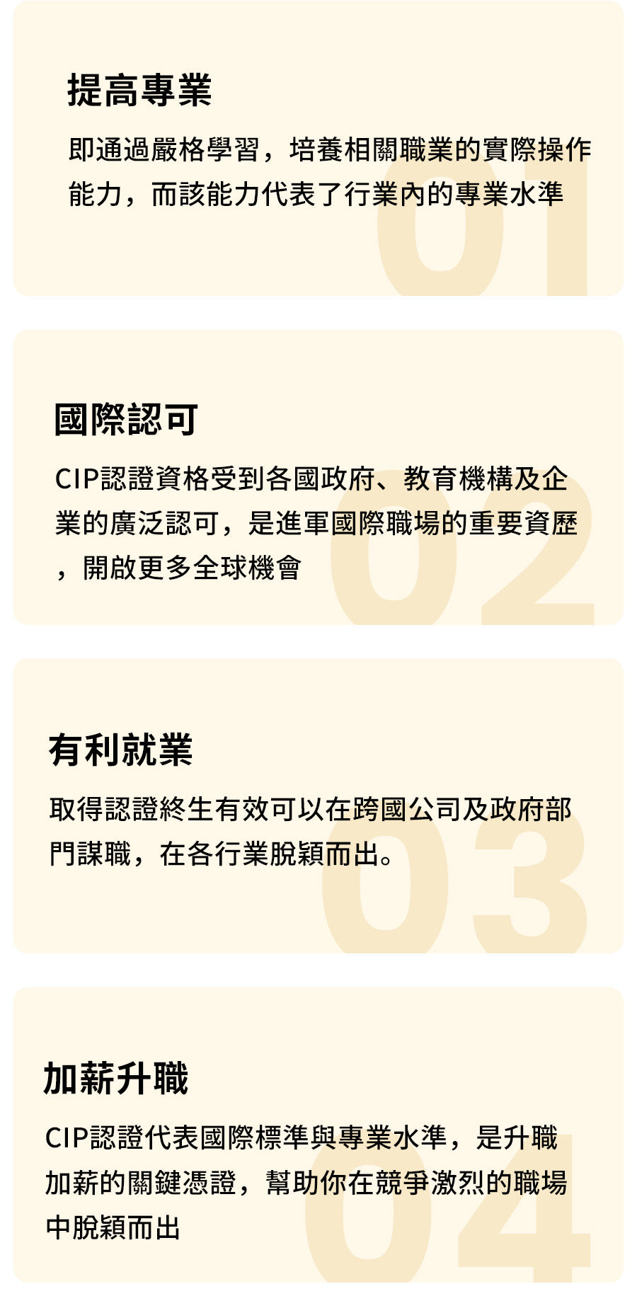 CIP單位全稱為「國際職業認證管理協會(Certified-International Professional ManagementAssoci-ation」,與一般證照的差異在於CIP認證的是職業能力,具有教學力與就業力認證,國際認證免重考。