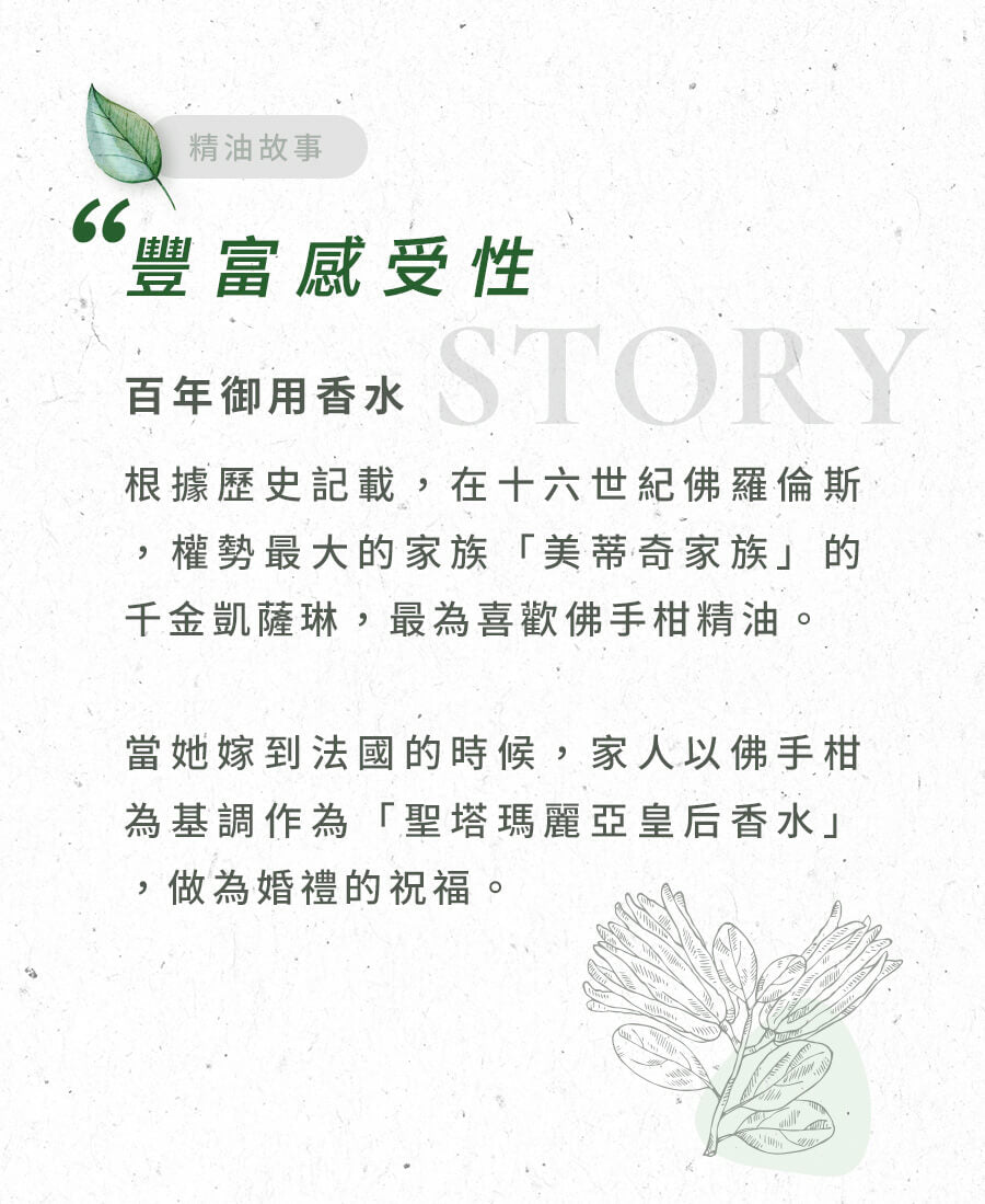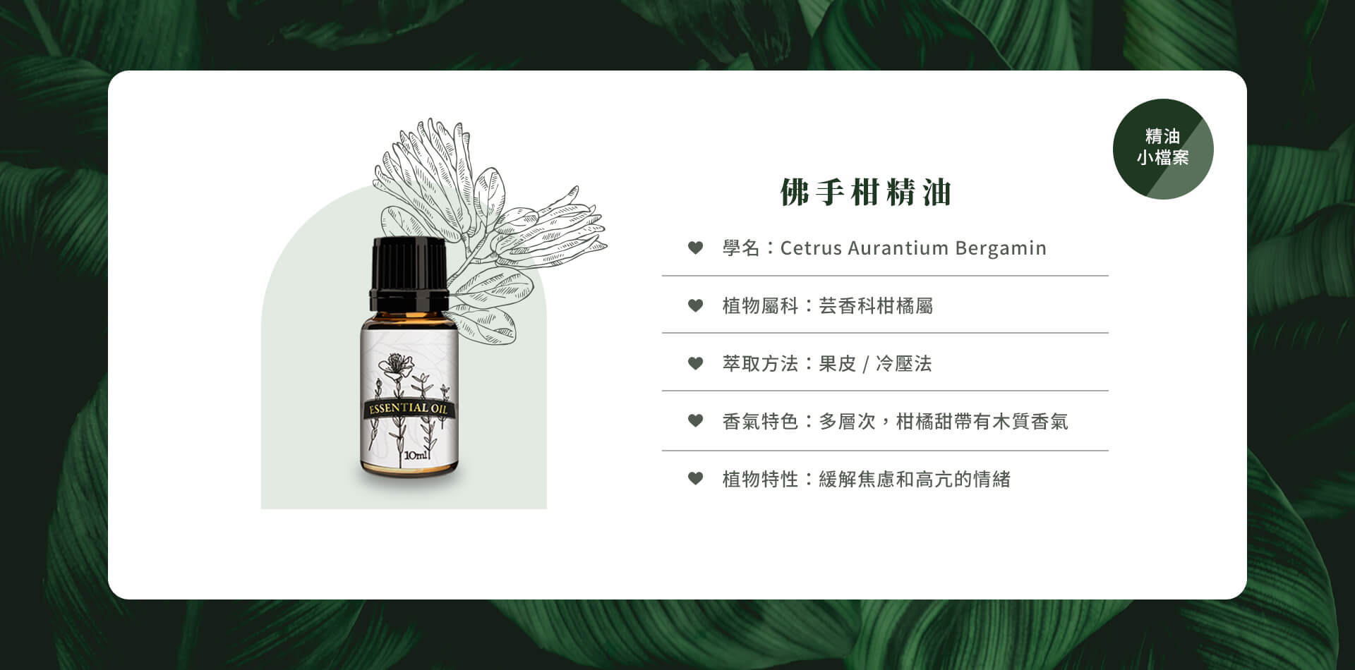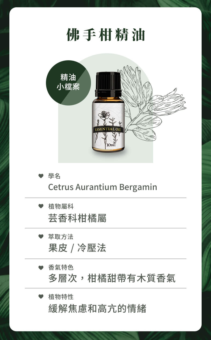 • 複合豐富花香及果香,佛手柑的強烈香氣在香水工業中廣受喜愛,是許多知名香水配方中不可缺少的一員,可說是精油中的寶石。