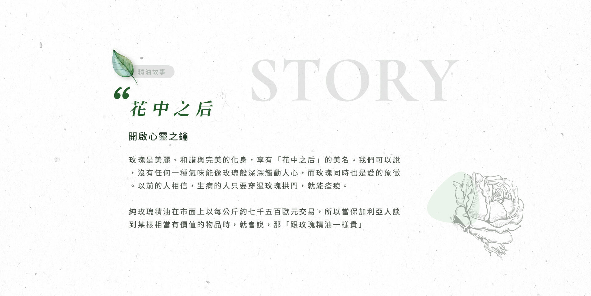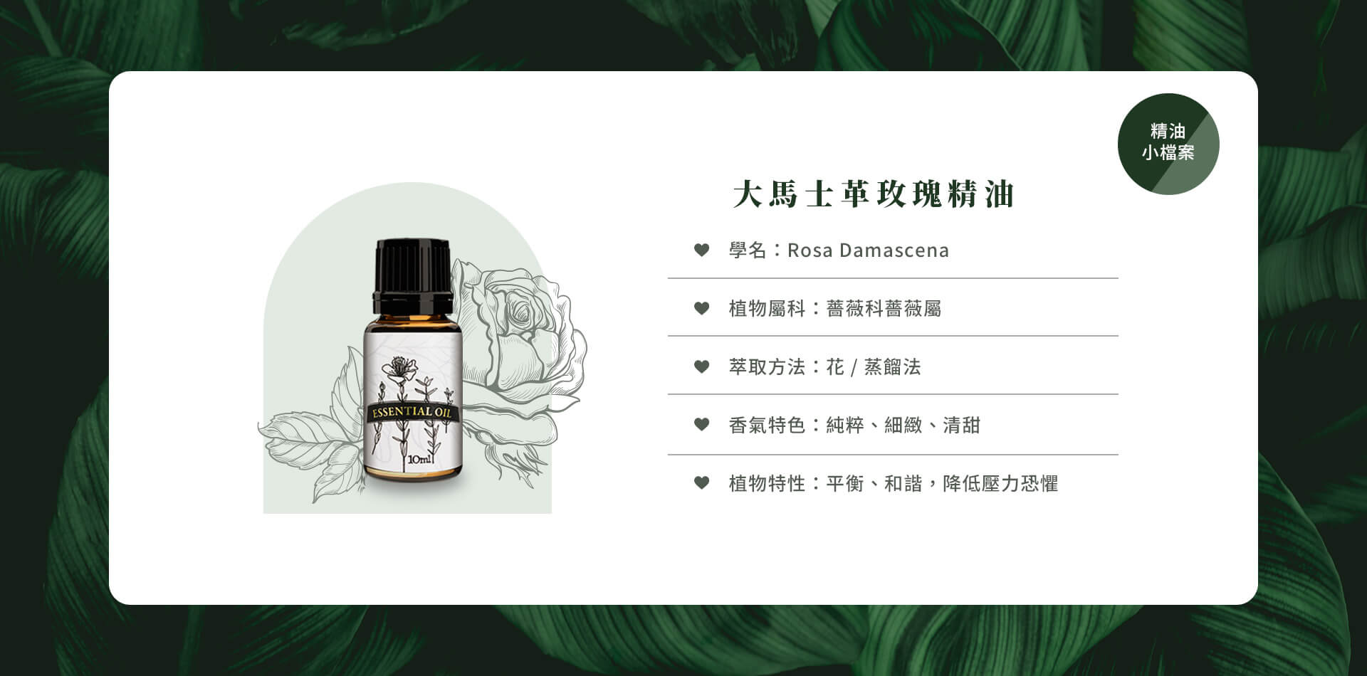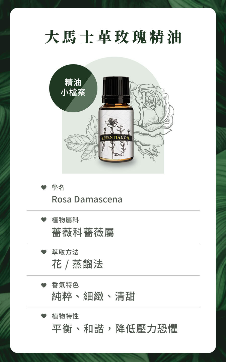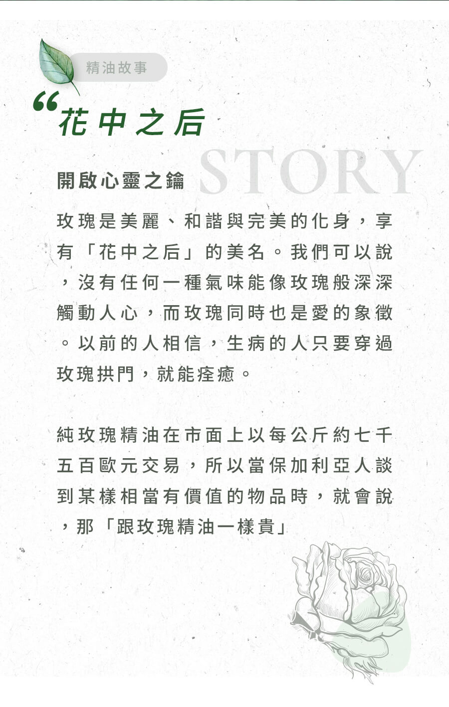 • 花香純粹、細緻,開花時散發出清甜的香味,具有甜香的香韻,初感香氣清雅可聞到濃郁的玫瑰香氣。玫瑰精油溫和、不刺激皮膚,適用於各種肌膚、各個年齡層。