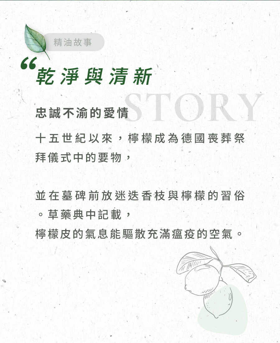• 微酸不膩的柑橘香氣親近而密切,純淨的氣息使心情變得輕鬆愉快,對焦慮、憂鬱有很好的幫助