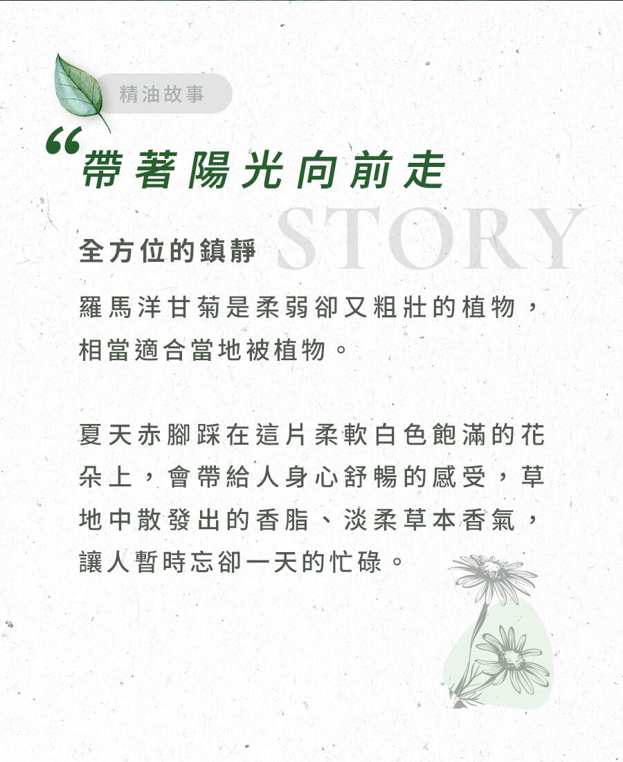 - 羅馬洋甘菊精油是大人小孩都喜愛的,接近蘋果蜜的味道,給人精神上的放鬆還有種幸福的愉快感。 對於內心不安六神無主或者陷於自身問題的大朋友可發揮呵護和保護的作用。