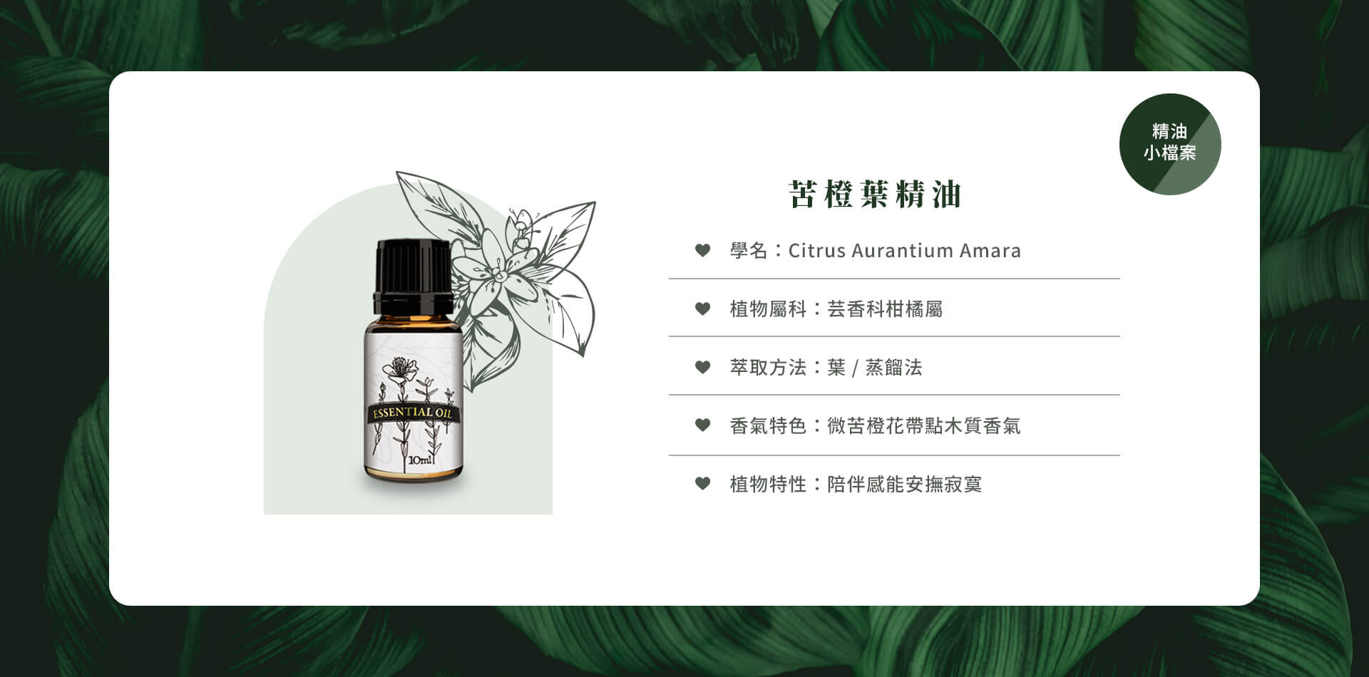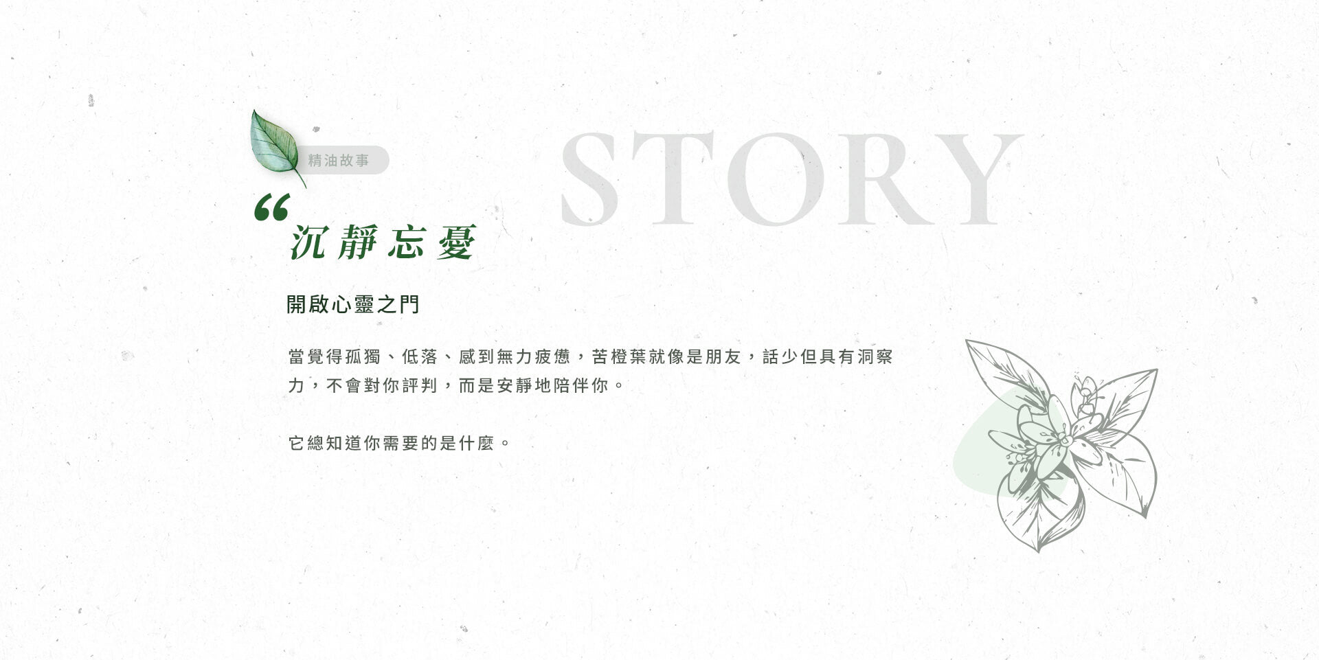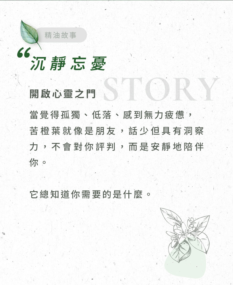 - 淡淡橙花香帶有些微苦味,草本與木質交替散發香,溫柔具陪伴感,能安撫寂寞感