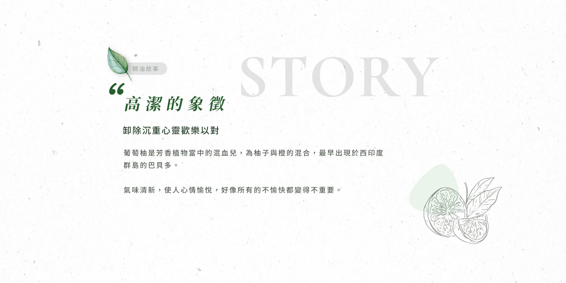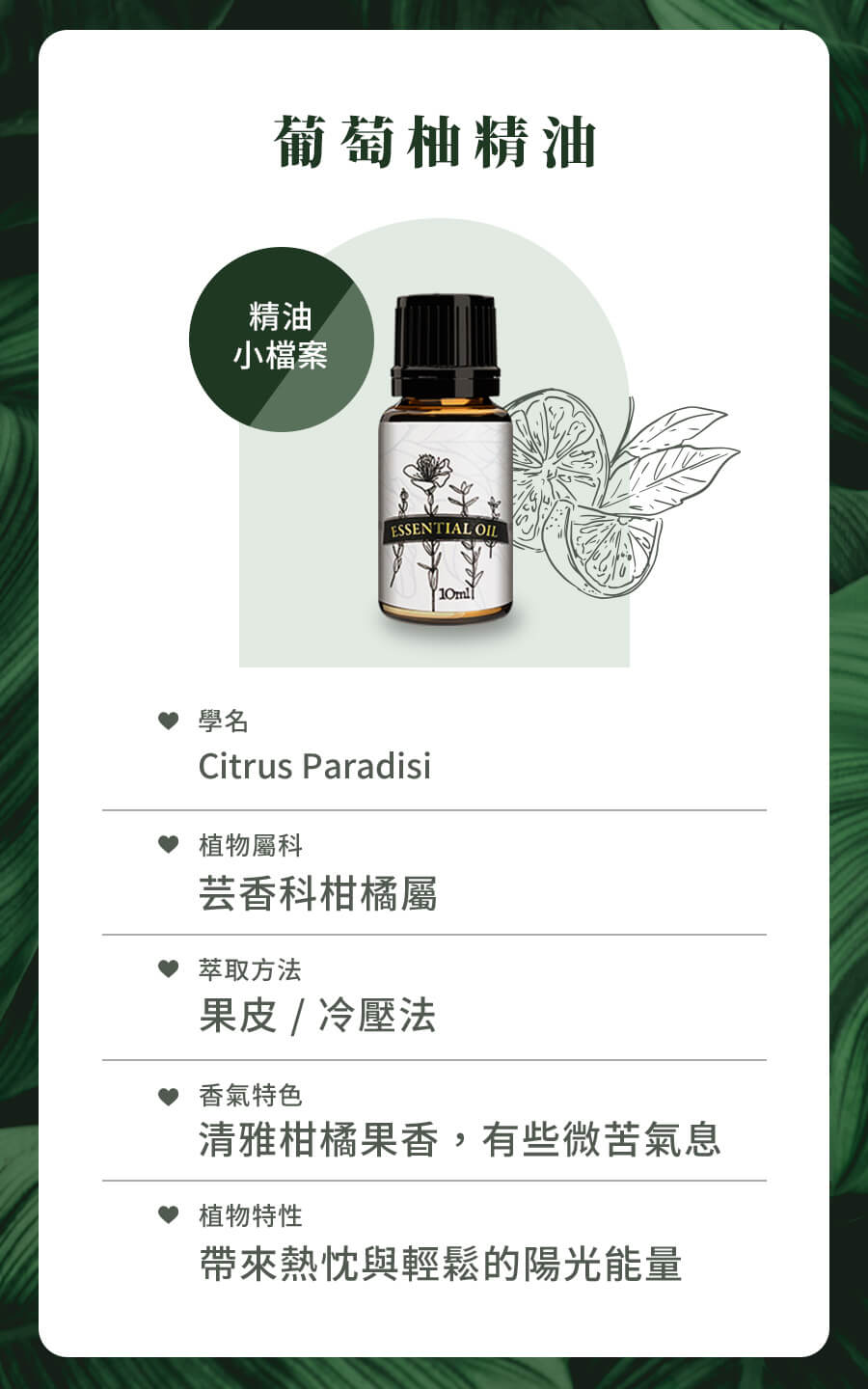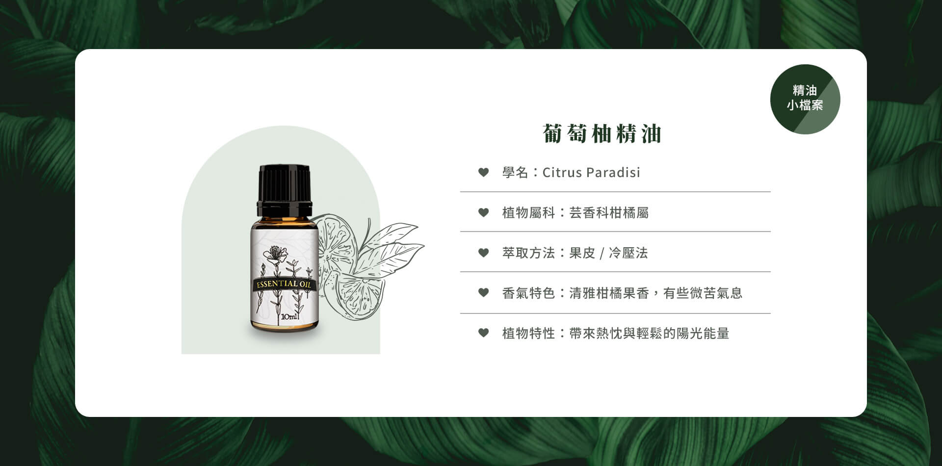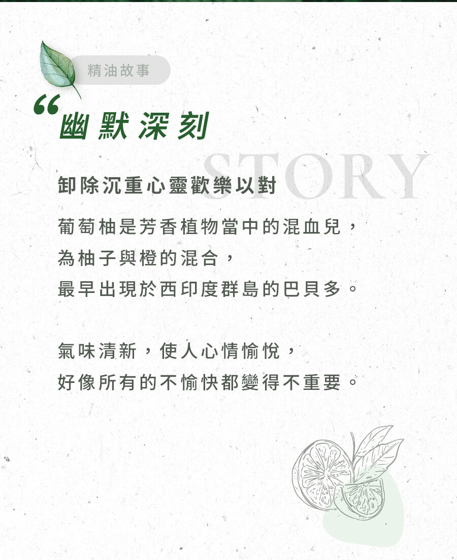 前段味帶有果香,清新強烈的典型氣味。葡萄柚精油對於興趣缺缺、疲憊、心情惡劣等狀態,有注入生命樂趣與輕鬆氛圍的作用。它能促進腦內啡分泌產生所謂「慢跑產生的愉悅」。
